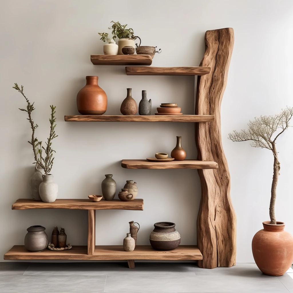 Tall, vertical layout with multiple layers to store books, art, plants, or daily essentials — ideal for modern apartments, lofts, and studios.