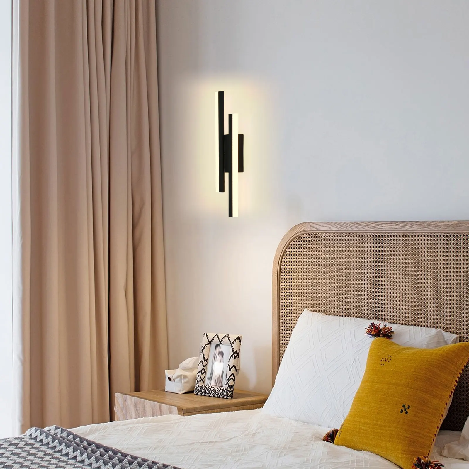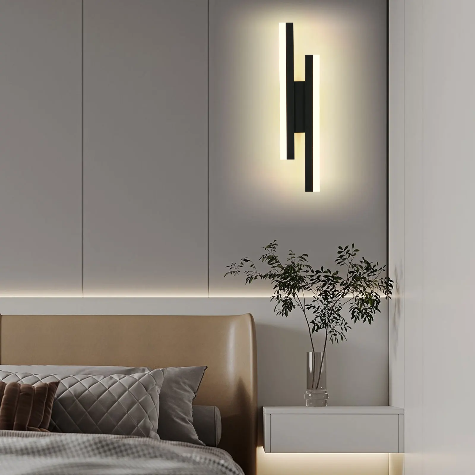 Modern wall sconce above a bed in a bedroom setting
